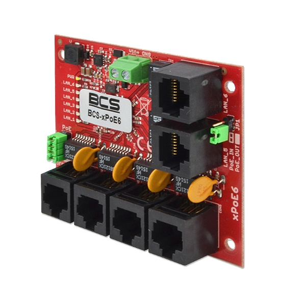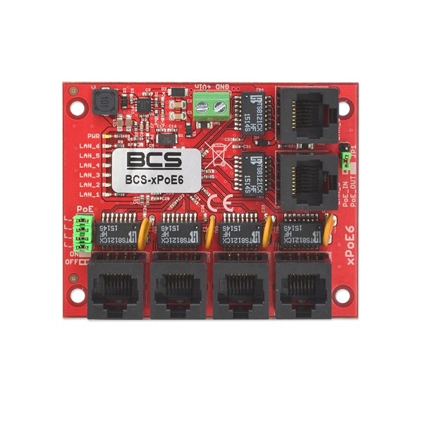Jedná se o 6 portový switch bez managementu 10/100. Modul umožňuje připojení k síti LAN a napájení 4 IP PoE kamer. Napájení poE portů se přenáší přímo ze vstupu (šroubovací svorky nebo port LAN+PoE IN). Každý Kanál PoE je nezávisle chráněn polymerovou pojistkou. Zařízení mohou být vzájemně připojena získáním 8, resp. 12; 16 portů pro IP kamery POE.