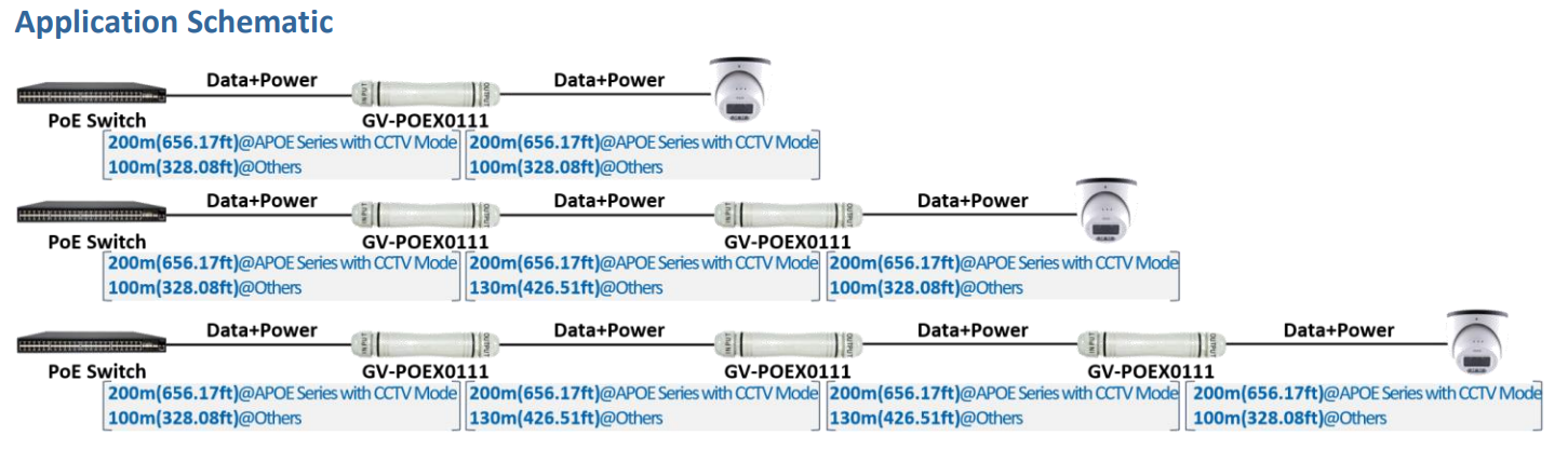 GV-POEX0111 je jednoportový 10/100/1000 PoE prodlužovač (Extender), který může prodloužit vzdálenost mezi PoE switchem a GV-IP kamerou o dalších 100 m. Lze sériově zapojit více zařízení (až 3) a přenášet tak data a napájení GV-IP kamery až 400m z PoE switche.